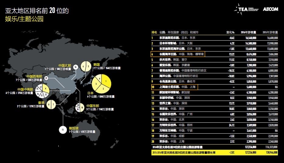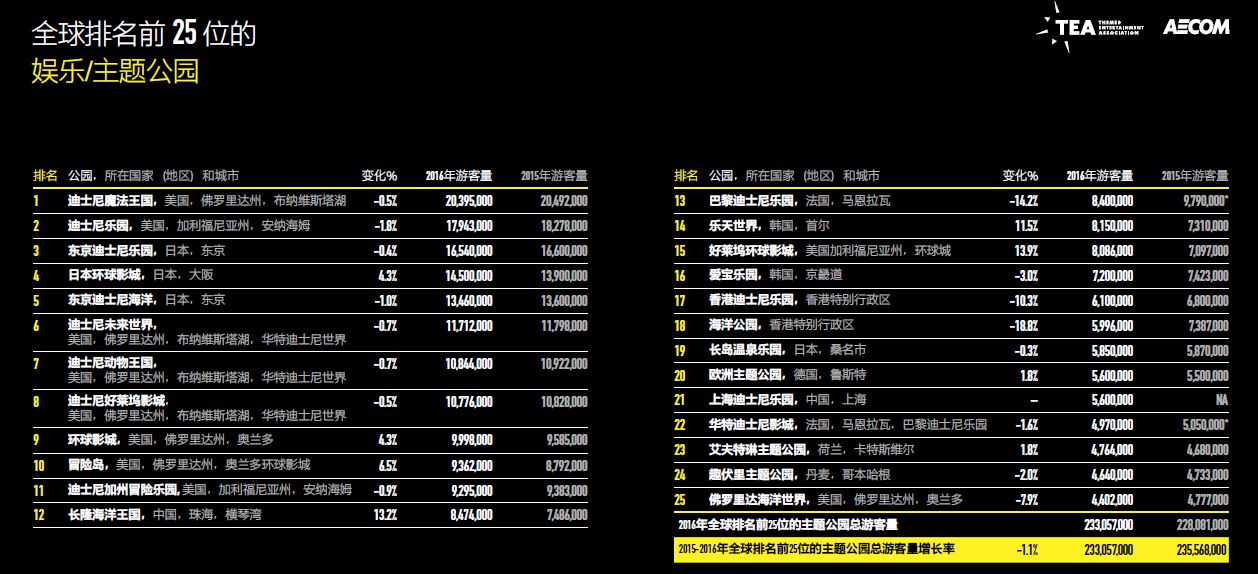 由主題娛樂協(xié)會(huì)(Themed Entertainment Association,簡(jiǎn)稱“TEA”)與AECOM聯(lián)合推出的《2016主題公園報(bào)告和博物館報(bào)告》正式出版。報(bào)告顯示,盡管去年世界排名前25名的主題公園游客總量略降1.1%,但排名最前的10大主題公園運(yùn)營(yíng)商旗下的公園游客量卻增長(zhǎng)4.3%,從4.2億人次增長(zhǎng)至4.38億人次。
