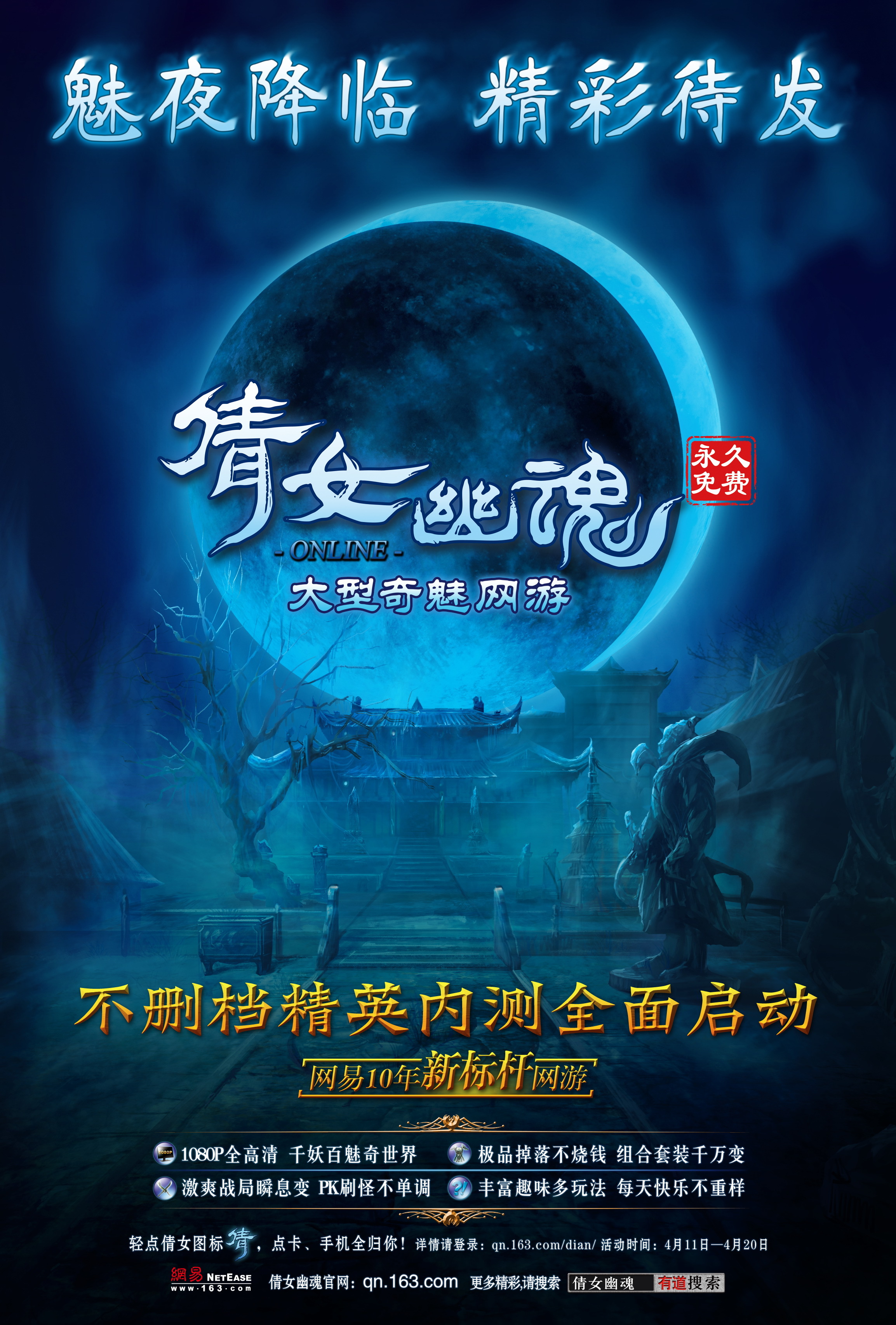 北京2011年4月1日電 /美通社亞洲/ -- 4月1日,網(wǎng)易公司(NASDAQ:NTES)宣布:網(wǎng)易即時(shí)制網(wǎng)游革新大作《倩女幽魂》將于4月22日全面啟動(dòng)不刪檔精英內(nèi)測(cè),屆時(shí),玩家無(wú)需激活碼即可登陸游戲。同時(shí),《倩女幽魂》全新神秘海報(bào)和八大職業(yè)全視角游戲內(nèi)實(shí)拍視頻正式曝光。