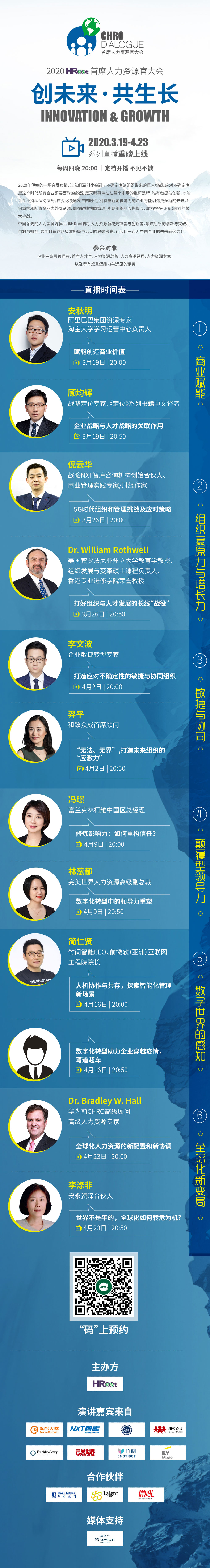 本次大會系列直播以“商業(yè)賦能 · 重構(gòu)資源 · 長期增長”為主題,共邀請到了12位重磅演講嘉賓,主要為世界級的人力資源專家與學者,以及來自華為、阿里巴巴、安永、完美世界、富蘭克林柯維、NXT智庫、竹間智能、和致眾成等知名企業(yè)和領(lǐng)先機構(gòu)的人力資源高管。
