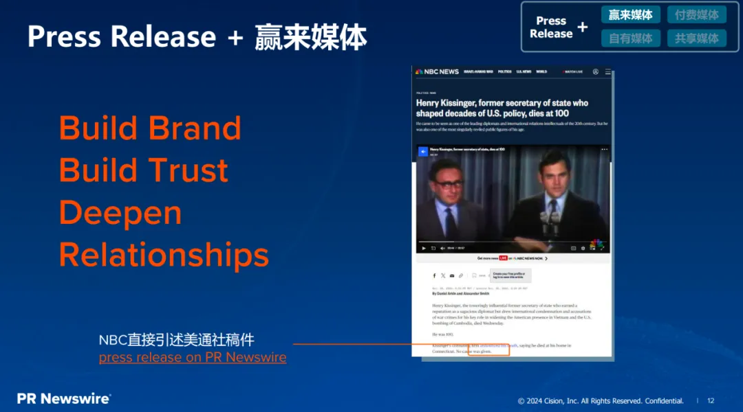 用案例來說。去年年底美國的外交官基辛格去世時(shí),權(quán)威媒體NBC News在報(bào)道這種突發(fā)性新聞的時(shí)候,直接引用了美通社發(fā)布的官宣稿件,這種經(jīng)由正規(guī)新聞發(fā)布機(jī)構(gòu)發(fā)布的內(nèi)容,自然更容易贏得權(quán)威媒體的關(guān)注與信任。