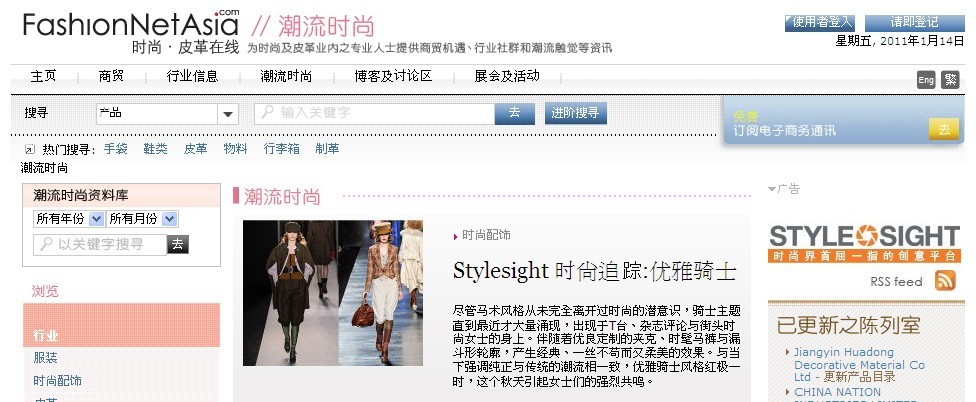 香港2011年1月17日電 /美通社亞洲/ -- FashionNetAsia (www.FashionNetAsia.com) 今日宣布將與Stylesight (www.stylesight.com/) 合作,在FashionNetAsia的“潮流時尚”欄目定期刊登由Stylesight時尚專家撰寫的全球時尚潮流分析及預(yù)測報告等。報告內(nèi)容將集中于FashionNetAsia供應(yīng)商的產(chǎn)品類別如鞋類、手袋配飾等。
