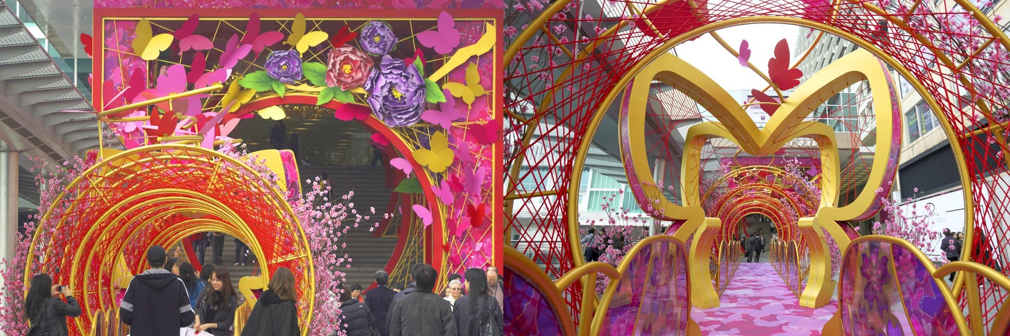 海港城海運(yùn)大廈正門設(shè)置以金色及桃紅色為主色,桃紅色的柱身及長(zhǎng)廊布滿了三千多只金色喜蝶,在巨型牡丹花叢襯托下翩翩起舞。而正門天花更掛上了3 組由許多只蝴蝶組成的12尺闊巨型喜蝶,俏麗的喜蝶在花叢中欣然起舞,春意盎然般躍現(xiàn)活潑朝氣,寓意“花開富貴”、“喜蝶迎春”,跟大家一起迎接新春佳節(jié)。