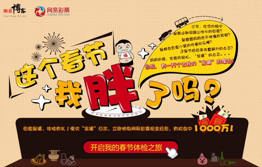 為感謝廣大用戶2010年一整年來對(duì)網(wǎng)易博客的關(guān)注和支持,在新春佳節(jié)來臨之際網(wǎng)易博客特別圍繞“回家過年的吃喝玩樂睡”等點(diǎn)滴情節(jié)而設(shè)計(jì)了這個(gè)全民參與的娛樂活動(dòng) --“這個(gè)春節(jié),我胖了嗎”。