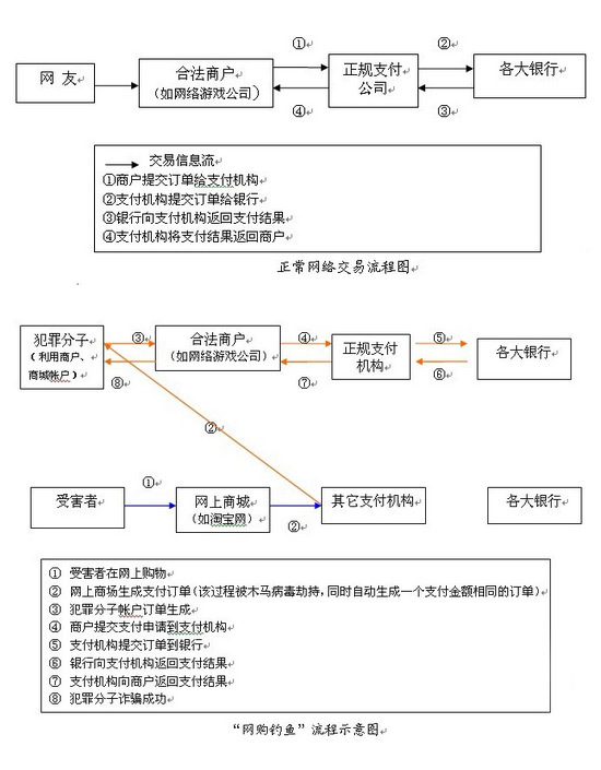示意圖如上(如圖所示,“正規(guī)支付機構(gòu)”兩端的流程都是正常流程,無法分辨是騙子還是受害者;但“網(wǎng)上商城”、“合法商戶”有責(zé)任追索到騙子):