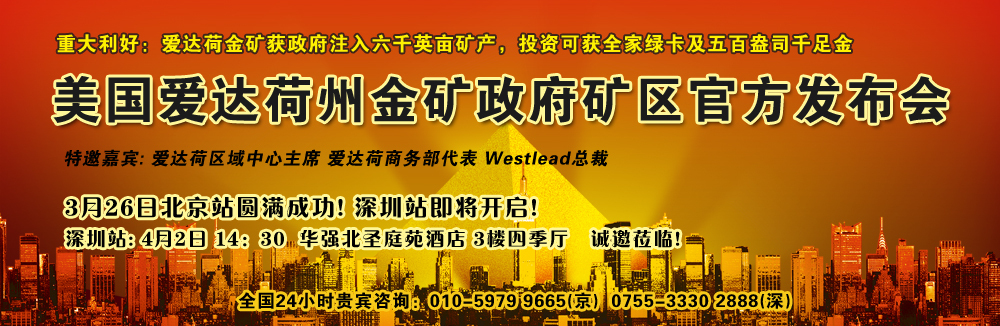 北京2011年3月29日電 /美通社亞洲/ -- 世通(北京)出入境有限公司將于2011年4月2日14:30在深圳舉辦美國投資移民精品項(xiàng)目-美國愛達(dá)荷州金礦項(xiàng)目發(fā)布會。