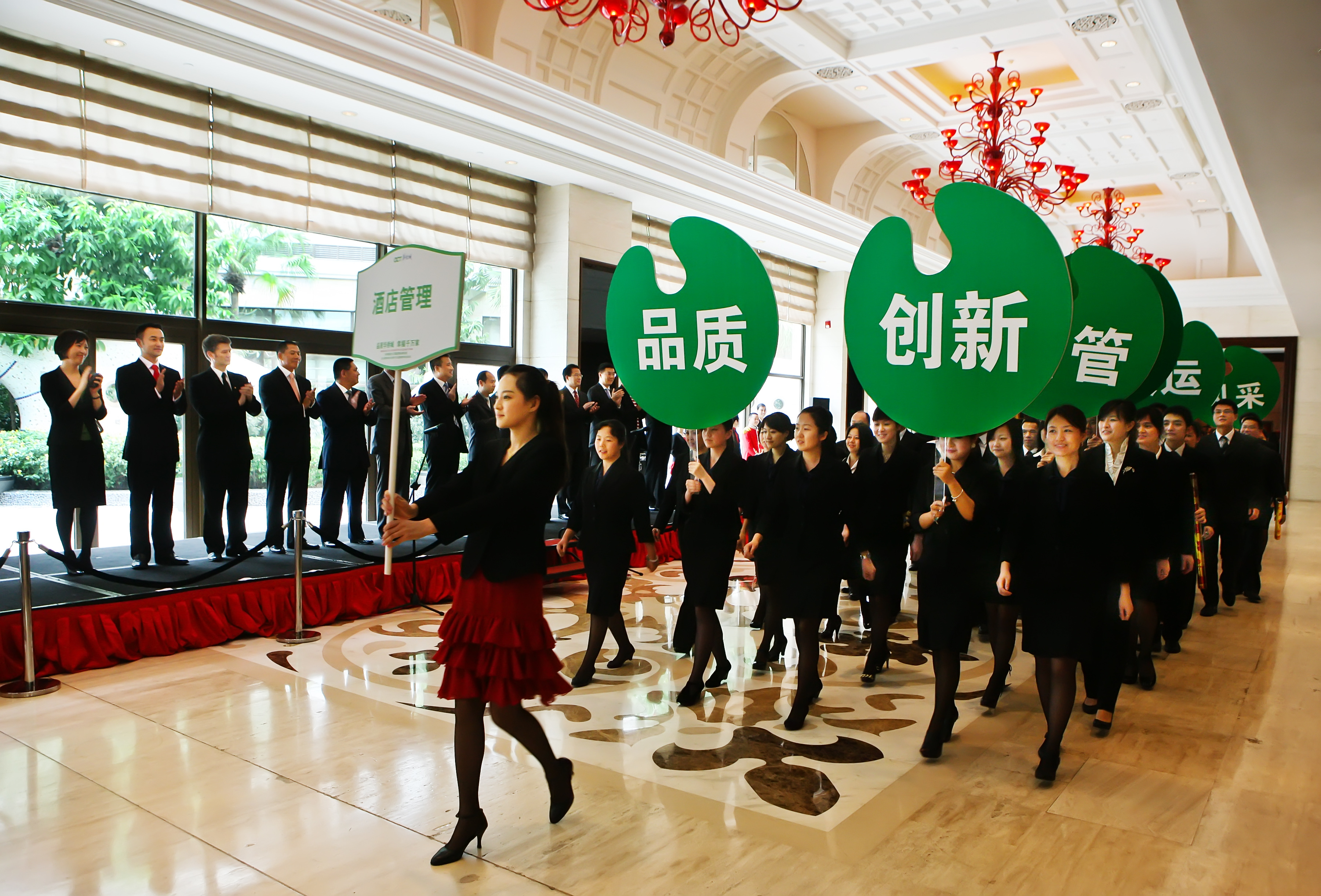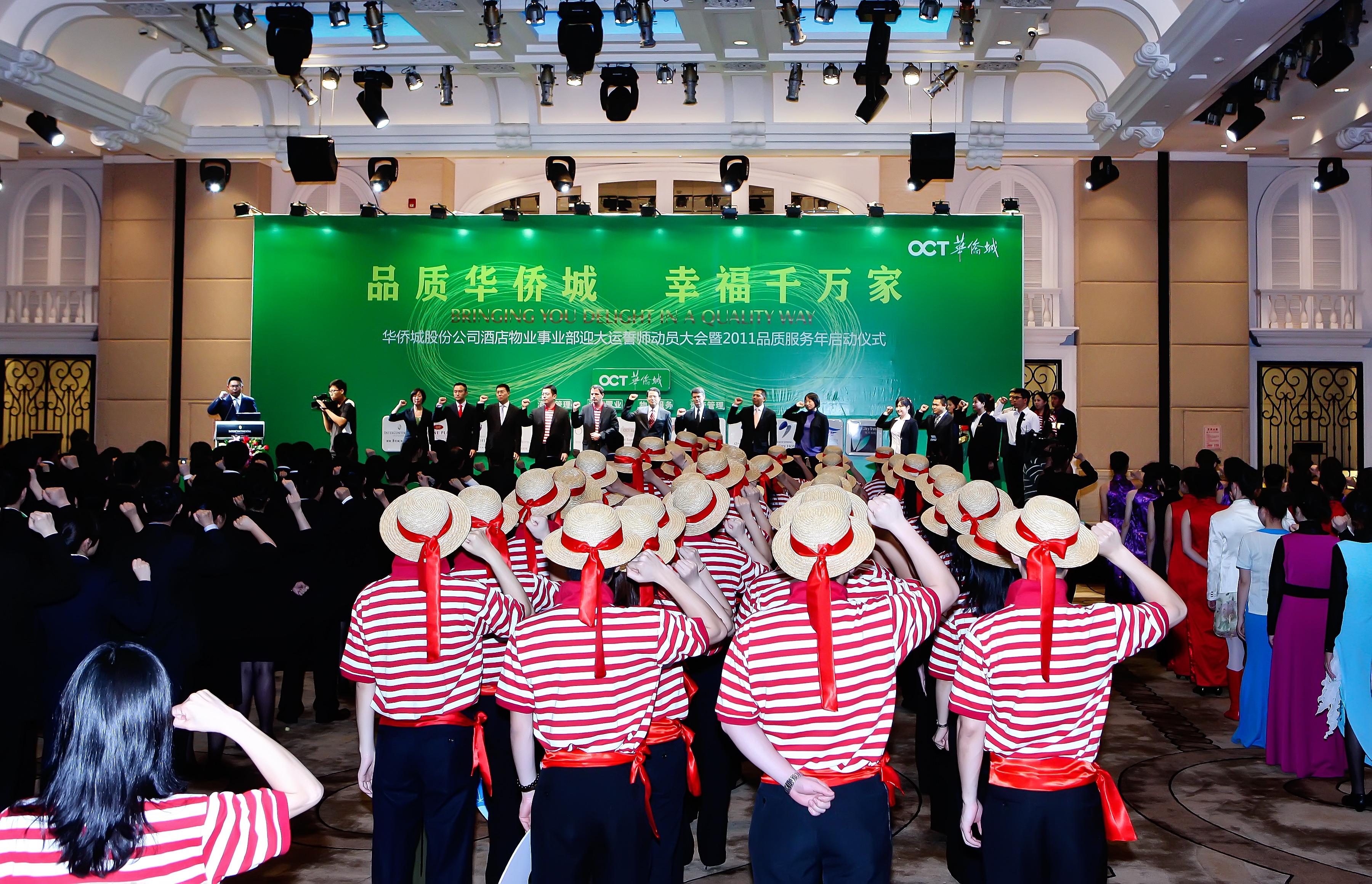 隨后,在酒店物業(yè)事業(yè)部副總經(jīng)理劉丹林的帶領下,各企業(yè)總經(jīng)理、員工代表一同登臺,共同發(fā)出有力誓言:“我們承諾,華僑城2011品質(zhì)服務年,圍繞‘品質(zhì)華僑城,幸福千萬家’的理念,保持專業(yè)、高效、卓越的服務水準,強化服務意識、提升服務技能,圓滿完成第26屆世界大學生運動會的服務工作,打造‘中國服務’的典范!”