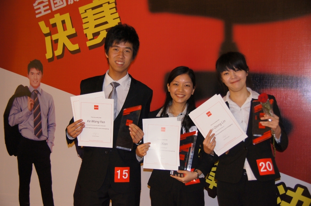 胡弦同學(xué)是暨南大學(xué)國際學(xué)院的大三學(xué)生,在班級(jí)中成績排名在前2%。她出眾英語能力深受評(píng)委們贊賞,此前還曾獲得廣東省大學(xué)生英語演講比賽第一名和全國 CCTV 英語演講比賽優(yōu)勝獎(jiǎng)。決賽之前,她就曾經(jīng)在4月16日 ACCA 就業(yè)力大比拼前20選手“職業(yè)訓(xùn)練營”的人際交往練習(xí)環(huán)節(jié)中獲得選手們共同票選的第一名。當(dāng)時(shí)選手們的職業(yè)訓(xùn)導(dǎo)導(dǎo)師程煜麟先生總結(jié)了選手們的意見,認(rèn)為胡弦獲勝的原因在于她在與人交談時(shí)始終表現(xiàn)出淡定、大方、誠懇和自信,讓與之交談的人感覺如沐春風(fēng)。亞軍柯汪堯同學(xué)也是一名大三學(xué)生,現(xiàn)就讀于廣東外語外貿(mào)大學(xué)國際商務(wù)英語學(xué)院國際貿(mào)易專業(yè),他在密鑼緊鼓準(zhǔn)備比賽的同時(shí)還在廣交會(huì)實(shí)習(xí),毅力過人的他克服了時(shí)間的困難,帶領(lǐng)比賽團(tuán)隊(duì)出色地完成項(xiàng)目,最終以成熟自信的表現(xiàn)獲得評(píng)委一致好評(píng)。與亞軍來自同一學(xué)院的辛瓊璘同學(xué)是國際商務(wù)(全英班)的學(xué)生,她親切大方的形象、良好的團(tuán)隊(duì)合作精神和敏捷的才思令評(píng)委們留下深刻印象。