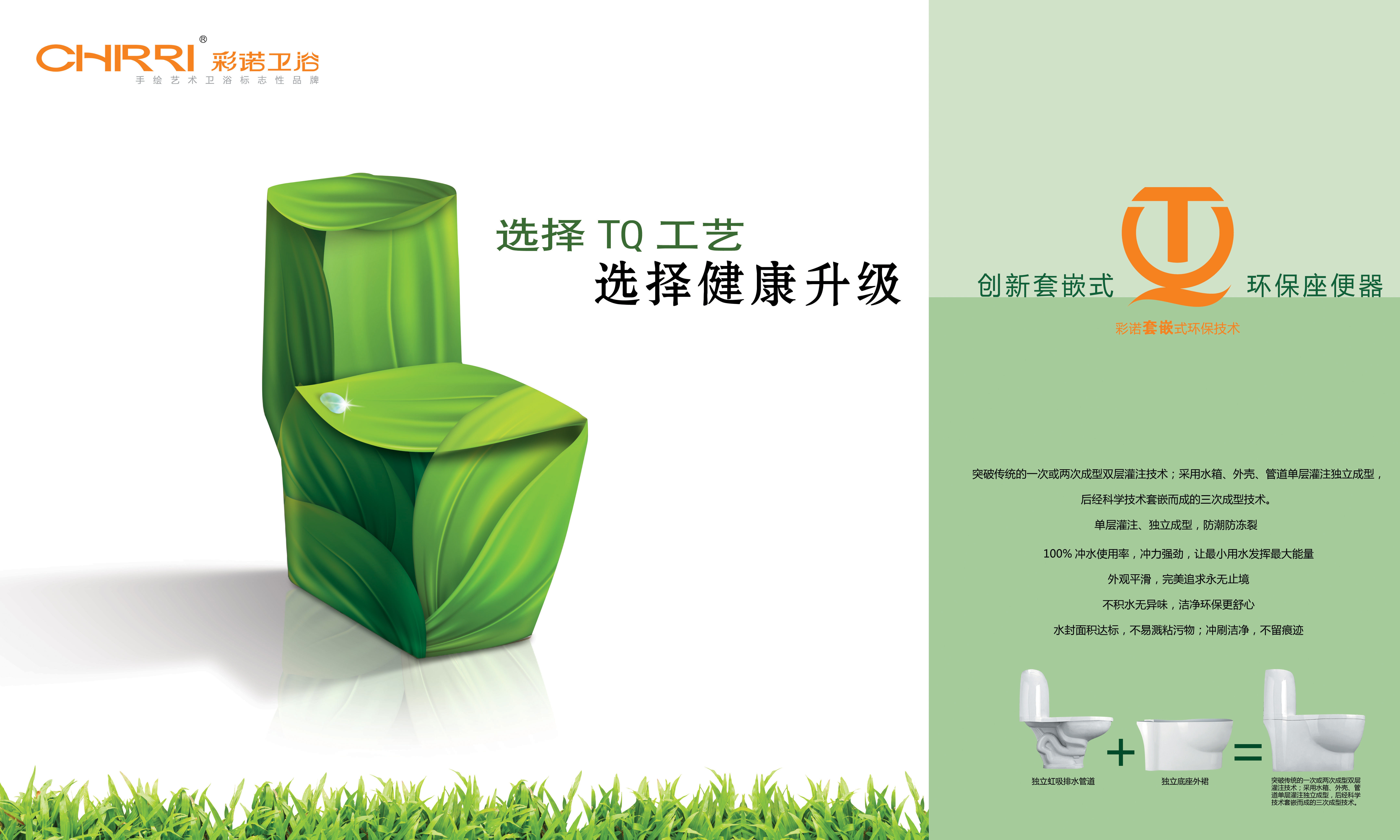 套嵌式環(huán)保技術(shù)(也稱 TQ 技術(shù))是突破傳統(tǒng)的一次或兩次成型雙層灌注技術(shù),創(chuàng)造性地采用水箱、外殼、管道單層灌注獨立成型,后經(jīng)科學(xué)技術(shù)套嵌而成的三次成型技術(shù)。那么,為什么要單獨成型呢?彩諾衛(wèi)浴相關(guān)技術(shù)人員表示,普通的座便器因排水管體與外裙一起煅燒,在制作成型過程灌漿不到位極容易留下縫隙,長期使用或因天氣變化,便會產(chǎn)生微滲水和漏水,出現(xiàn)積水、結(jié)冰、凍裂等現(xiàn)象。而彩諾采用分體煅燒,獨立成型,管壁厚度均勻結(jié)實無縫隙,做到防潮防凍裂并完全杜絕漏水;作為消費者普遍關(guān)注的節(jié)水問題也得到有效的解決,存水空間小使藏水量也大幅減少,按下水箱按鈕后水就直接往下沖,沖力更強勁,用最少的水發(fā)揮較大能量;并且在煅燒過程中受熱均勻,外觀線條更流暢,表面更平整美觀;而底座內(nèi)部無空隙,使用過程不積水,不容易滋生細(xì)菌,即便長久不用也不會產(chǎn)生異味,潔凈環(huán)保更舒心。正如套嵌式環(huán)保技術(shù)的形象口號:選擇 TQ 工藝,選擇健康升級。