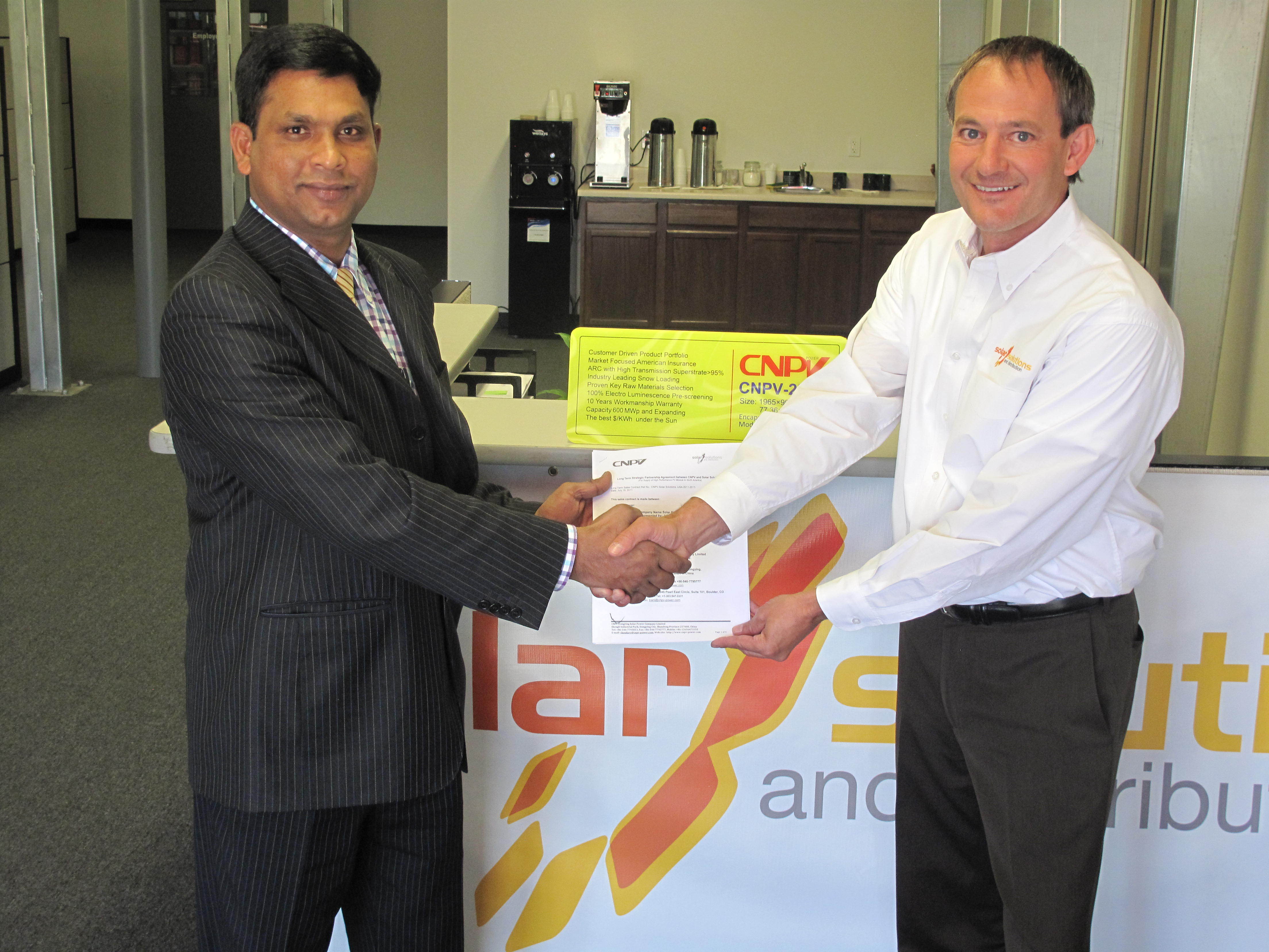 根據(jù)該戰(zhàn)略協(xié)議,CNPV 將在2011至2013年期間共為 Solar Solutions 提供100MWp 的高性能光伏組件,其中包括計劃于2011年交付的10MWp 的組件。剩余的40MWp 和50MWp 組件計劃將分別于2012年和2013年交付。協(xié)議條款內(nèi)包括一份明確的積極拓展計劃,它將使最初設定的銷量大大增加。憑借其特殊設計的經(jīng)營結(jié)構(gòu),Solar Solutions 可立即回答通訊信息并可在全美各地24小時之內(nèi)交貨。Solar Solutions 及其區(qū)域合作代理商均認為,他們能夠通過現(xiàn)有的客戶群進一步迅速地擴大市場。