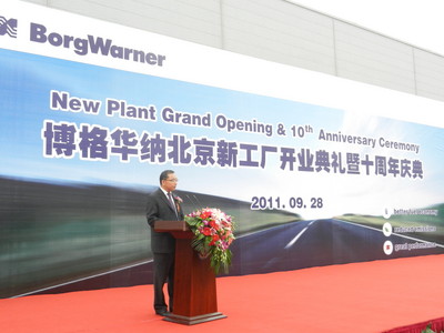 伴隨著博格華納董事會主席兼首席執(zhí)行官 Mr. Tim Manganello 先生熱情洋溢的致辭,博格華納北京新工廠開業(yè)典禮暨十周年慶典拉開序幕。Tim Manganello 先生自豪地宣布:“通過十年的不懈努力,北京博格華納成長為中國市場上較大的分動器生產(chǎn)企業(yè)。這是以博格華納獨有的方式 -- 領(lǐng)先的技術(shù)、質(zhì)量、生產(chǎn)和安全在中國取得成功的又一典范。博格華納會秉承與客戶合作的理念,未來將先進的技術(shù)引入中國,與中國客戶共同成長。”