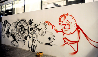 紅毯儀式后,所有活動來賓進(jìn)入主展廳,一同欣賞了本次藝術(shù)展的所有潮流展品,以及活動專為主贊助商諾基亞N9設(shè)計制作的藝術(shù)裝置“云聚.云散”。北京二十二院街藝術(shù)區(qū)策劃總監(jiān)高原Gary、黑松藝術(shù)企劃總經(jīng)理嬉皮Hippie(趙竹松)兩位作為2011瑪克思潮哮藝術(shù)展主要策展人分別上臺致辭,并向來賓介紹了瑪克思潮哮活動品牌的緣起理念。連凱andrew作為本次參展藝術(shù)家代表也表達(dá)了自己對“瑪克思潮哮”的期待和見解。隨后,連凱andrew、李璨琛Samlee、米原康正real、高原Gary、嬉皮Hippie五人在臺上與臺下眾嘉賓共同舉杯歡慶,并表達(dá)對2012瑪克思潮哮藝術(shù)展的期待。在活動現(xiàn)場,來自法國的涂鴉藝術(shù)家CEET與北京噴子成員SOOS,在長達(dá)10米的涂鴉墻上盡情表達(dá)創(chuàng)作靈感,現(xiàn)場觀眾無不驚嘆他們創(chuàng)意性的潮流表達(dá)。