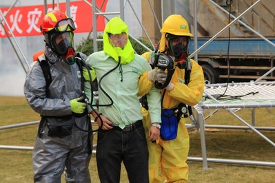 整場(chǎng)演習(xí)的大部分環(huán)節(jié)由梅思安(MSA)安全培訓(xùn)中心承辦,梅思安(MSA) 安全培訓(xùn)中心經(jīng)理孫健先生擔(dān)任此次演練的總策劃及現(xiàn)場(chǎng)解說(shuō)員。整個(gè)演練共分四個(gè)部分,首先開始的是“密閉空間應(yīng)急救援”配備了正壓式長(zhǎng)管供氣呼吸器的隊(duì)員 在其他隊(duì)友的協(xié)助下,通過(guò)營(yíng)救單元的滑輪繩索,快速下降到罐底,為被救者套上正壓式緊急呼吸器的頭罩施救,并利用營(yíng)救單元的滑輪繩索施救。 接下來(lái)“救援技術(shù)展示及高空救援演練”詳細(xì)展示了表演了高空救援的救援技術(shù)。第三科目為化學(xué)氣體泄漏逃生及應(yīng)急救援演練。救援隊(duì)員利用了先進(jìn)的熱成像儀進(jìn) 行搜索發(fā)現(xiàn)了中毒者倒地的地點(diǎn),利用所帶正壓式呼吸器他救功能救出被救者。隊(duì)員利用 MSA BD2100 一分鐘快充功能,可以立刻相互充氣,確保任務(wù)完成。而最后一部分上海石化消防支隊(duì)開展了精彩的消防演習(xí)。