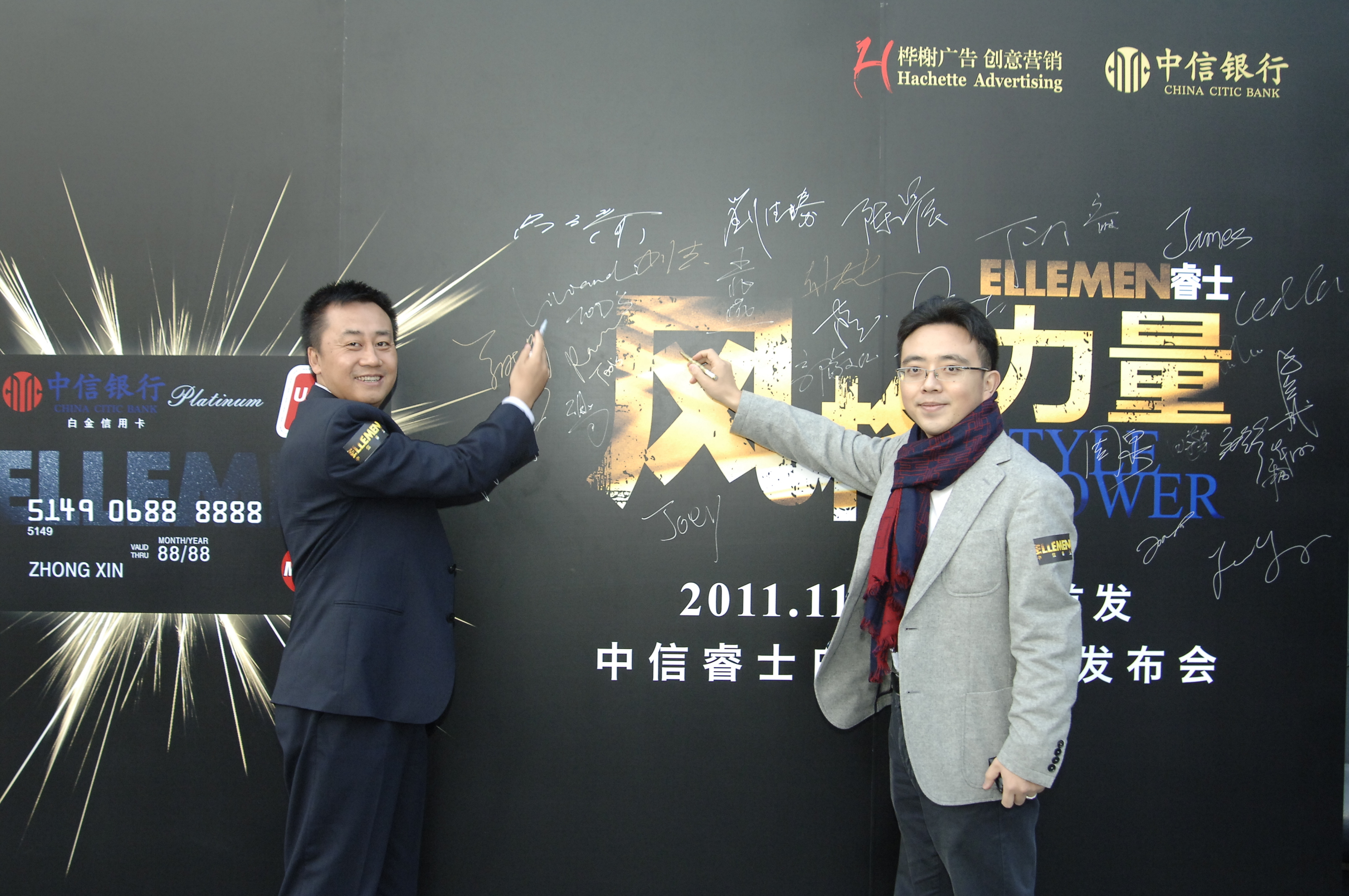作為“創(chuàng)意營銷”的倡導(dǎo)者,樺榭中國為這張“爺們兒”的信用卡召集了群英薈萃的中信睿士顧問團(tuán),涵蓋了豪車、賞表、品酒、投資、攝影、健身、旅游、時裝等當(dāng)下品位男士熱衷的各個領(lǐng)域。中信睿士信用卡將以男士的興趣愛好為持卡權(quán)益切入點(diǎn),以各行業(yè)泰斗翹楚為顧問網(wǎng)絡(luò),力求為信用卡持有人建立符合自己消費(fèi)喜好和生活志趣的交際圈。發(fā)布會現(xiàn)場隆重推出首批7位顧問團(tuán)代表暨中信睿士白金信用卡持卡人:豐實(shí)資本控股有限公司董事長盧長祺、《Car and Driver 名車志》創(chuàng)意總監(jiān)兼首席攝影師劉杰、鐘表收藏界泰斗及德國Chronos雜志中文版《Chronos手表》發(fā)行人兼主編丁之向、ASC Fine Wines大中華區(qū)葡萄酒教育和培訓(xùn)經(jīng)理,葡萄酒講師,專欄作者郝利文、《ELLE MEN睿士》編輯總監(jiān)李寶劍、中國超跑車隊理事長,第一支參加國際頂級GT比賽中國車隊負(fù)責(zé)人嚴(yán)路、全國十佳健身先生,國際健身大會培訓(xùn)師朱曉輝等7位風(fēng)范一代意見領(lǐng)袖。