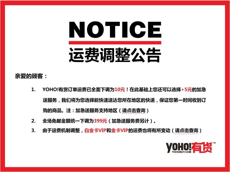 2012年起,YOHO!有貨將原來每單15元的運(yùn)費(fèi)下調(diào)至10元,購物滿一定金額可免郵的門檻也由原來的500元下調(diào)至399元。YOHO!有貨物流負(fù)責(zé)人許凱介紹:“在快遞漲聲一片的大環(huán)境下,我們承擔(dān)差價(jià)補(bǔ)貼來下調(diào)運(yùn)費(fèi),希望降低用戶潮流網(wǎng)購的門檻。在此基礎(chǔ)上,仍會(huì)保持以往優(yōu)質(zhì)的物流服務(wù),運(yùn)費(fèi)降了,服務(wù)不能降。”針對節(jié)假日的購物高峰,YOHO!有貨還推出加急送服務(wù),從訂單審核、物流制單、揀貨包裝、分撿出庫等各環(huán)節(jié)采取優(yōu)先措施,更大程度上滿足不同用戶的物流需求。