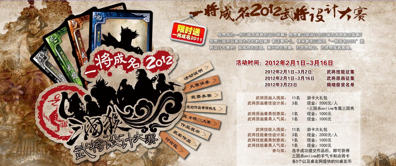 3月23日一將成名2012武將設(shè)計(jì)大賽的即將揭曉獲獎(jiǎng)名單,敬請(qǐng)期待!