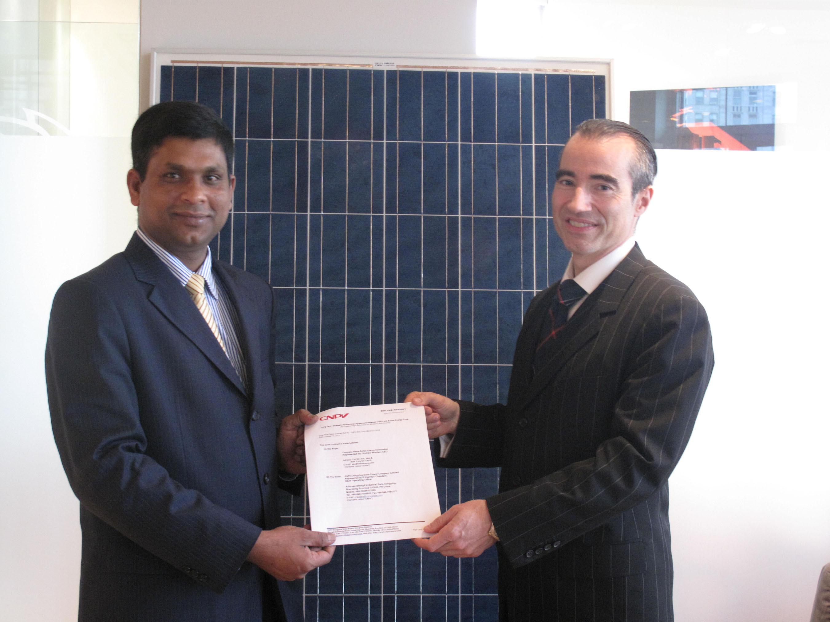 CNPV 首席執(zhí)行官張順福先生與 CNPV 首席運營官 Bypina Veerraju Chaudary 先生一同表示:“這種規(guī)模的合作可實現(xiàn)巨大的價值。憑借這一專長和影響力來開發(fā)的實用太陽能解決方案是一種非常難能可貴的產(chǎn)品。與一些更加知名和規(guī)模更大的品牌相比,我們能夠達到 Soltas Energy 的高標準,我們對此感到非常自豪。我們完全支持 Soltas Energy 致力于在2016年之前完成1GWp 安裝工作的承諾,并對能夠與這樣一家可靠且有實力的公司合作而感到尤為自豪。通過與 Soltas Energy 合作,我們能夠?qū)μ柲芄夥袌霎a(chǎn)生積極的影響。”