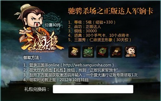 今年即將舉行的第十一屆三國(guó)殺王者之戰(zhàn)中將全面啟用新的三國(guó)殺3v3競(jìng)技規(guī)則,并啟用新的三國(guó)殺3v3專用牌。同時(shí),在新一版,也就是2012版三國(guó)殺3V3專用牌中內(nèi)含第十一屆三國(guó)殺王者之戰(zhàn)的報(bào)名卡一張。此卡將在王者之戰(zhàn)官網(wǎng)(http://king.sanguosha.com)報(bào)名參賽時(shí)使用。另外,除常規(guī)贈(zèng)送的閃卡外,在2012版三國(guó)殺3V3專用牌中還隨贈(zèng)三國(guó)殺online正版達(dá)人軍餉卡,做為游卡桌游對(duì)長(zhǎng)期支持正版的玩家的達(dá)謝。