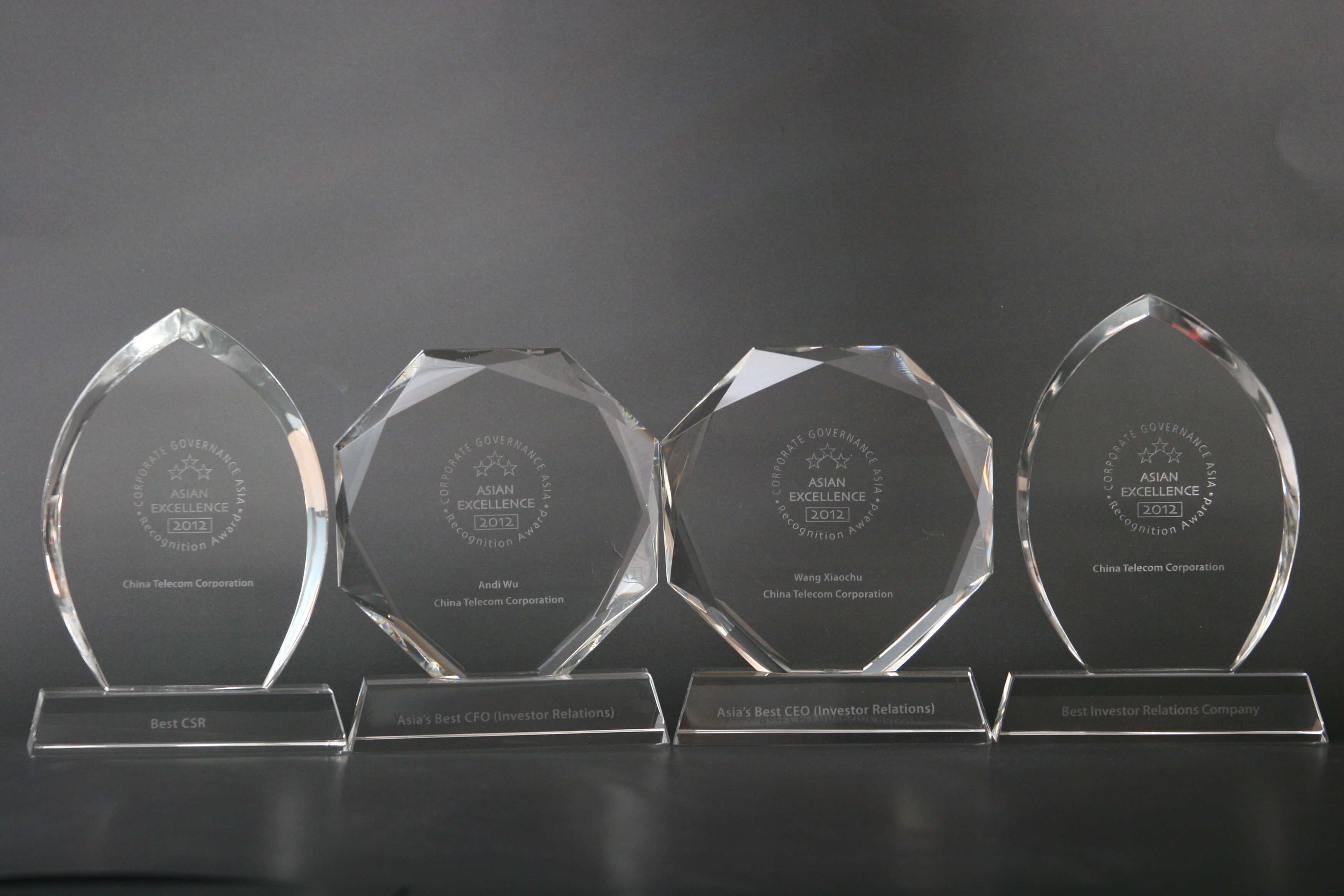 《Corporate Governance Asia》贊揚中國電信在保持企業(yè)穩(wěn)健經(jīng)營、發(fā)展壯大的同時,回報社會,服務客戶,關愛員工,回饋股東。公司努力把企業(yè)發(fā)展與經(jīng)濟、社會、環(huán)境發(fā)展融為一體,推動整個社會的和諧與進步。“亞洲卓越企業(yè)表揚大獎”旨在表彰在投資者關系、商業(yè)操守、企業(yè)社會責任、環(huán)保措施及財務績效等方面擁有杰出表現(xiàn)的亞太區(qū)企業(yè)。