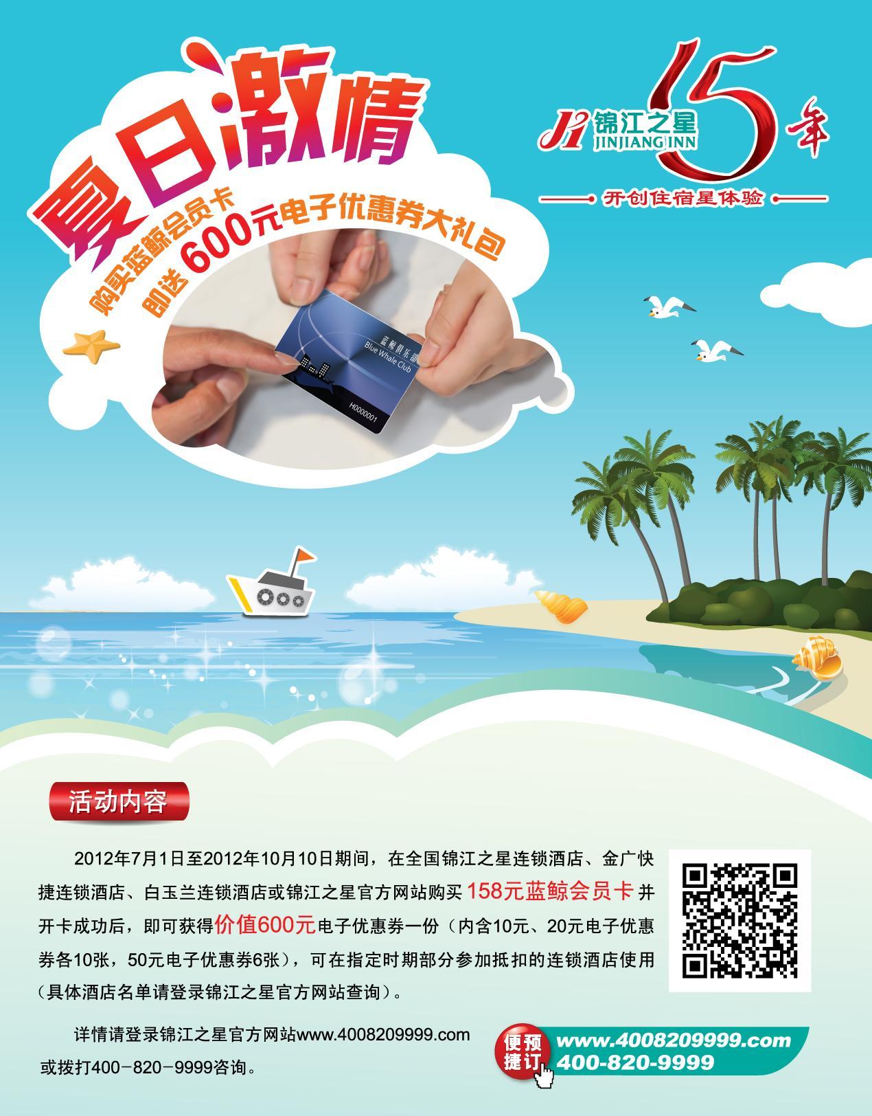 “夏日激情”活動(dòng)時(shí)間為2012年7月1日至10月10日,在此期間,凡在全國范圍內(nèi)所有已開業(yè)的錦江之星、金廣快捷和白玉蘭酒店前臺(tái)購買,或登錄錦江之星官網(wǎng) www.4008209999.com 在線購買藍(lán)鯨會(huì)員卡,開卡成功后,系統(tǒng)自動(dòng)短信提示,可獲贈(zèng)價(jià)值600元的電子優(yōu)惠券(電子優(yōu)惠券內(nèi)含10元抵扣券×10張,20元抵扣券×10張,50元抵扣券×6張,電子抵扣券使用期均為2012年11月1日-2013年3月31日),新會(huì)員可根據(jù)短信提示登陸系統(tǒng)獲得電子優(yōu)惠券的使用權(quán)。該券可在會(huì)員價(jià)的基礎(chǔ)上每間夜再享受抵扣。除了錦江之星的藍(lán)鯨會(huì)員卡外,交通銀行辦理的錦江之星聯(lián)名卡,也可參加此次活動(dòng)。