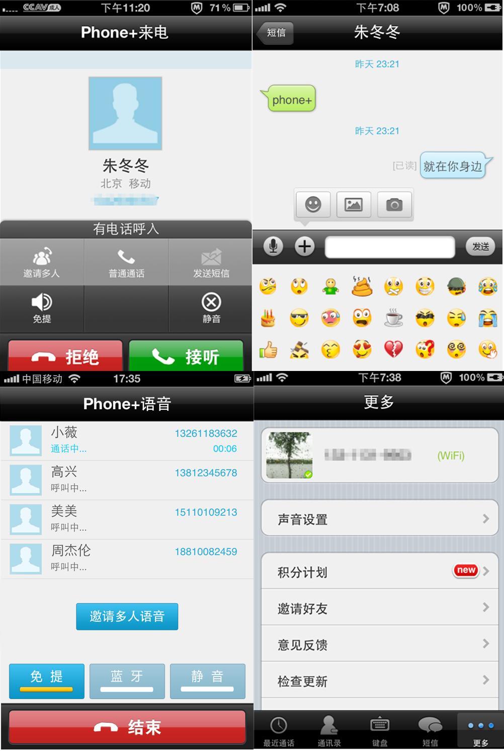 撥號鍵盤與系統(tǒng)自帶界面基本保持一致,撥號時phone+會進行智能定位,且可操作性更好,隱藏通話記錄功能相當實用,讓語音旅程無跡可尋。當phone+聯(lián)系人來電時有豐富的選擇,去電時,無法接通的情況給予友好提醒;短信界面清爽簡潔,在系統(tǒng)自帶文字發(fā)送功能基礎上新增語音對講/表情發(fā)送/拍照發(fā)送/照片視頻傳輸?shù)葘嵱霉δ埽乖究菰锏亩绦抛兊昧Ⅲw生動形象起來。
