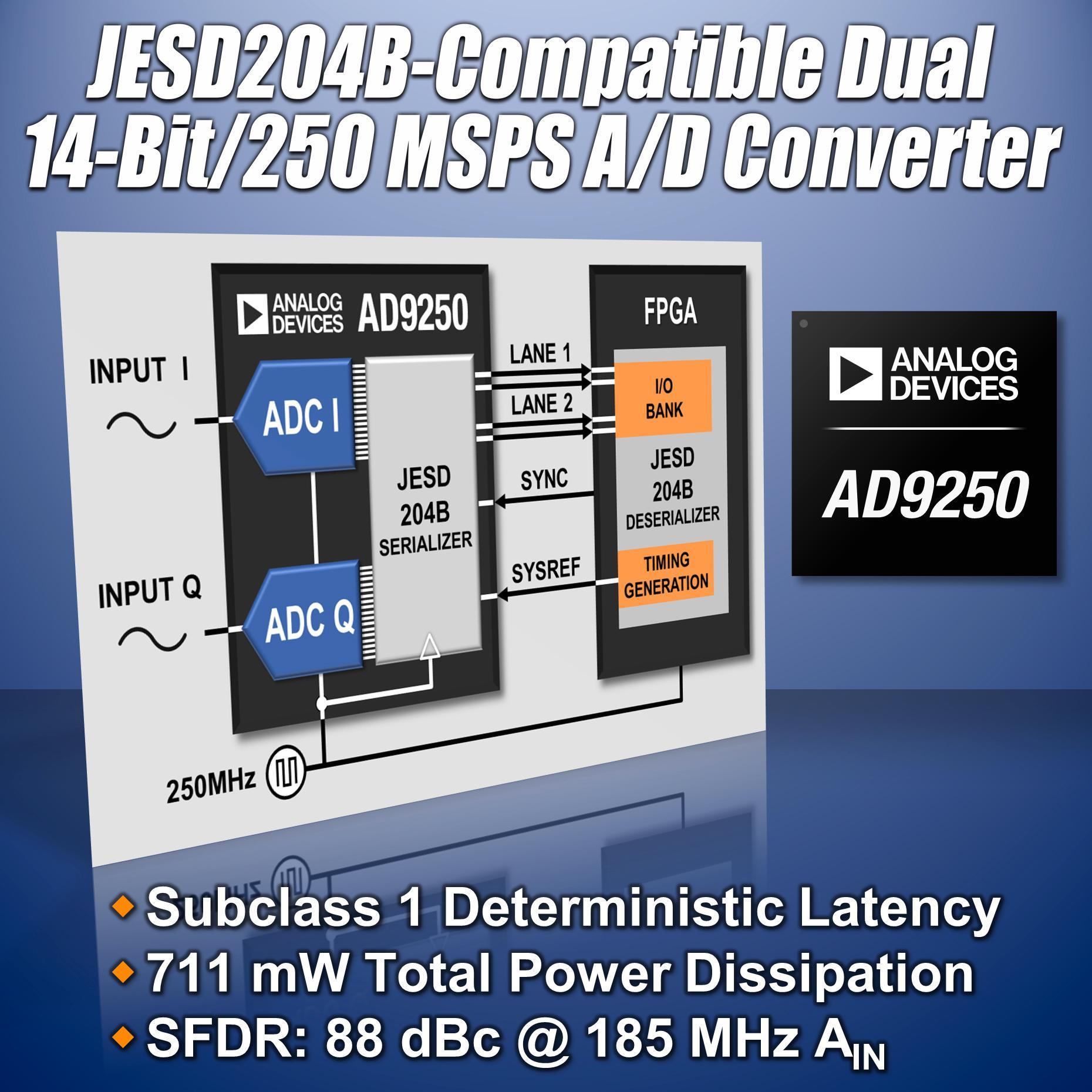 新型雙通道14位250 MSPS ADC AD9250通過JESD204B兼容輸出與高速FPGA無縫連接,并支持精密多通道轉(zhuǎn)換器同步。