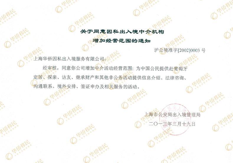 經(jīng)過幾個月漫長的考核,上海市公安局出入境管理局認可了華僑移民增加辦理葡萄牙移民經(jīng)營范圍。華僑移民可以為中國公民提供赴葡萄牙定居、探親、訪友、繼承財產(chǎn)和非公務活動提供介紹、法律咨詢、溝通聯(lián)系、境外安排、簽證申辦及相關服務的活動。華僑移民終于獲批上海市公安局出入境管理局的正式批文,并已經(jīng)送達華僑移民上海總部。