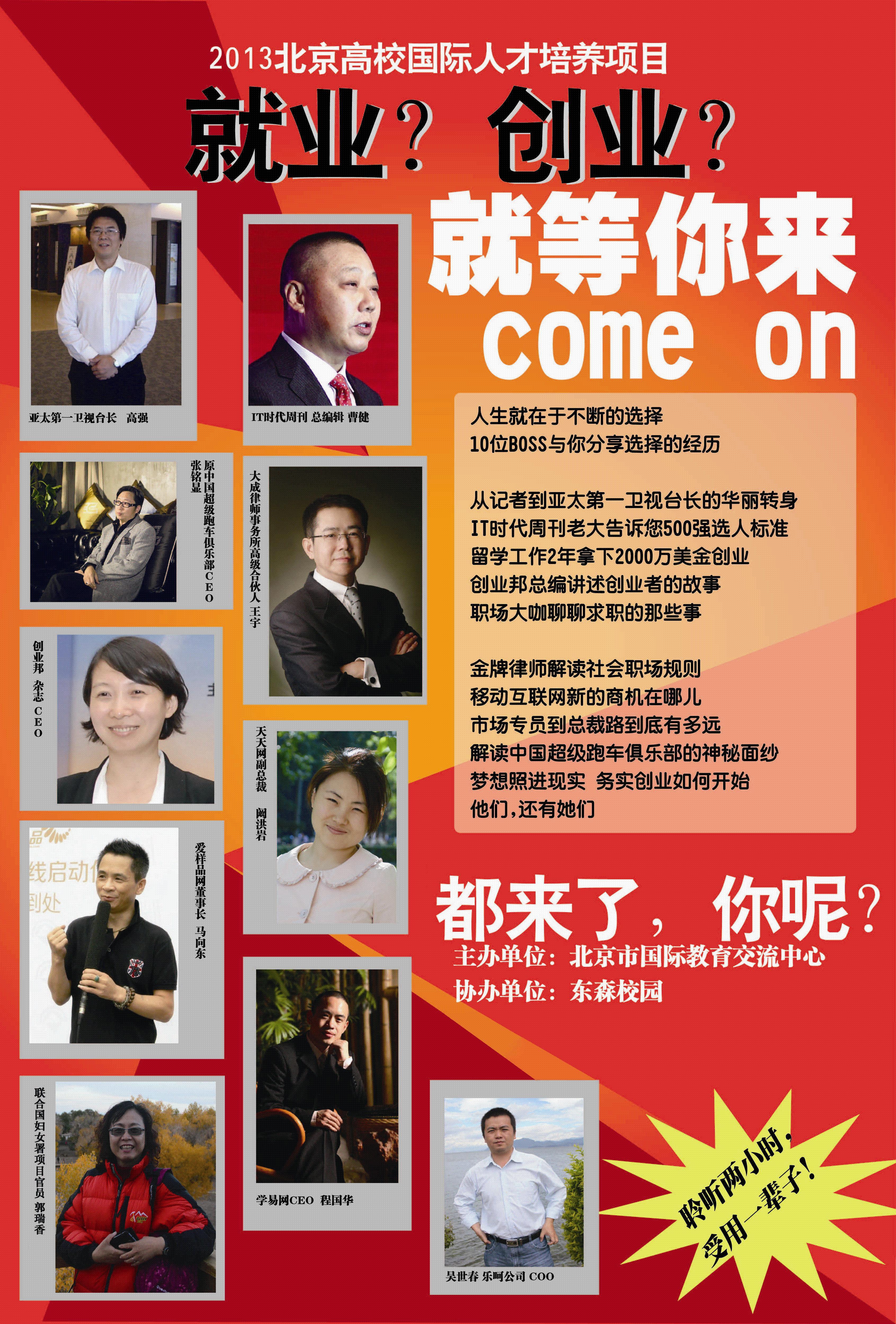 本次活動邀請到香港亞太第一衛(wèi)視臺長高強(qiáng)先生,聯(lián)合國婦女署中國項目官員郭瑞香女士、IT時代周刊總編輯曹健先生,大成律師事務(wù)所高級合作人王宇先生,學(xué)易網(wǎng)CEO程國華先生等10位業(yè)界精英組成主講嘉賓團(tuán),他們將分別在10所高校圍繞國際形勢,結(jié)合大學(xué)生的就業(yè)現(xiàn)實和創(chuàng)業(yè)需求進(jìn)行自身成長經(jīng)歷、創(chuàng)業(yè)歷程、海外工作等方面的分享。