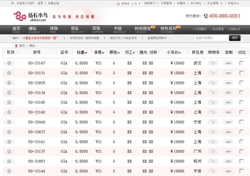 上海匯金百貨的一家珠寶品牌店的負(fù)責(zé)也印證這一說法,她舉了一個(gè)例子:一顆“50分的G色 VS1,3EX”的成品鉆石女戒,3年前,可以輕松賣到2.5萬左右,后來專柜品牌之間的競爭加劇,也就不得不打折賣到2.2萬,即便是這樣還要經(jīng)受不住電商的沖擊,她就親自上鉆石小鳥的官網(wǎng)查詢過,同樣的一顆裸鉆,鉆石小鳥只賣1.6萬不到,記者通過查詢鉆石小鳥的官網(wǎng)印證了這一說法。