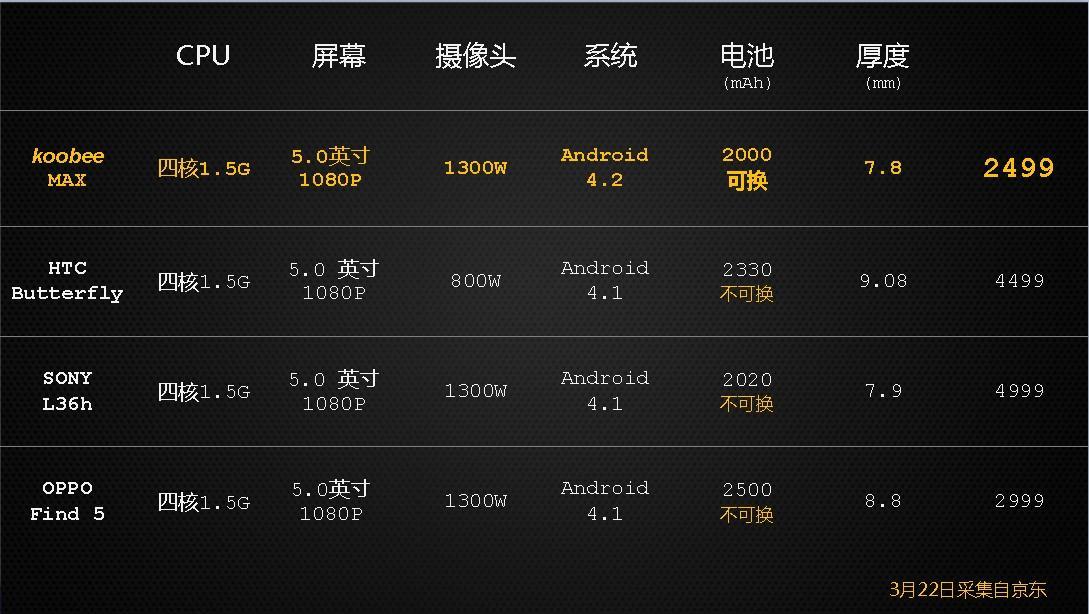 作為2013年最受期待的影音旗艦智能機,koobee MAX采用了一塊5.0英寸1080 P屏幕,分辨率高達1920x1080像素,PPI達到441,屏幕畫面精細度極高,顯示效果出色,同時屏幕玻璃為康寧二代大猩猩玻璃,擁有超強的硬度。MAX搭載1.5G四核處理器,內(nèi)置1300萬像素攝像頭,拍攝功能強大,支持HDR和高速連拍高速攝像功能。音樂功能也非常出色,內(nèi)置專業(yè)音樂芯片,擁有HIFI音質(zhì)。此外該機支持先進的WiFi-display等功能。