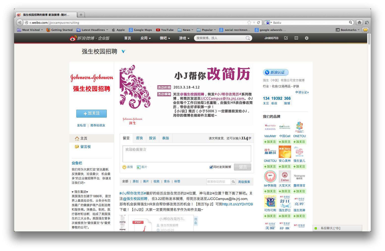 毋庸置疑,對于企業(yè)而言,為了使社交媒體賬戶擁有更大訪問量,舉辦活動始終是一種非常好的方法。然而 ,我們卻見許多企業(yè)將原本應(yīng)以“分享與評論”為主題的活動變?yōu)椤瓣P(guān)注并抽獎”的形式。盡管后者也能達(dá)到品牌推廣的目的,但是與前者相比,這種互動方式常常只能產(chǎn)生較低的參與率。最近,強(qiáng)生集團(tuán)在其新浪微博校園招聘賬戶上發(fā)起了一項(xiàng)名為“小J幫你改簡歷”的活動。在參與活動的過程中,學(xué)生們可以將個(gè)人簡歷發(fā)給強(qiáng)生集團(tuán)并且對相關(guān)活動內(nèi)容進(jìn)行評論和轉(zhuǎn)發(fā)。每一天,強(qiáng)生集團(tuán)人力資源部會選出一份簡歷對其進(jìn)行修改,并將修改樣本發(fā)布在其微博平臺供學(xué)生們下載、參考。這個(gè)活動的亮點(diǎn)部分,是使粉絲有機(jī)會獲得專業(yè)意見,并且從中獲益,從而不僅確保了參與率,同時(shí)提高了雇主品牌影響力。