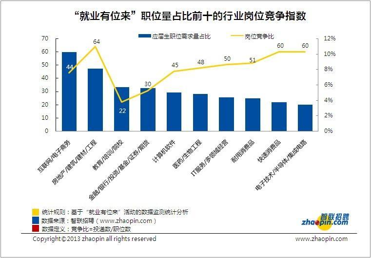 智聯(lián)招聘對“就業(yè)有位來”發(fā)布的崗位從城市分布、行業(yè)分布等角度進行了數據分析。結果顯示,互聯(lián)網/電子商務行業(yè)崗位需求量猛勁,居46大行業(yè)之首。該行業(yè)職位量占全部行業(yè)職位的10%,居首位。但崗位競爭指數并不樂觀,居中等偏下的位置。深入分析互聯(lián)網/電子商務行業(yè),發(fā)現(xiàn)民營企業(yè)的職位量占比高達61%。智聯(lián)招聘《2013大學生就業(yè)形勢報告》指出,受規(guī)模、知名度等影響,應屆生對于“皇糧”的熱衷程度依舊居高不下。而民營企業(yè)的急速擴張導致對人才的需求量也在不斷上漲。但落花有意流水無情,求職者對于民營企業(yè)的崗位并不熱衷。這也是導致互聯(lián)網行業(yè)人才難求的原因之一。