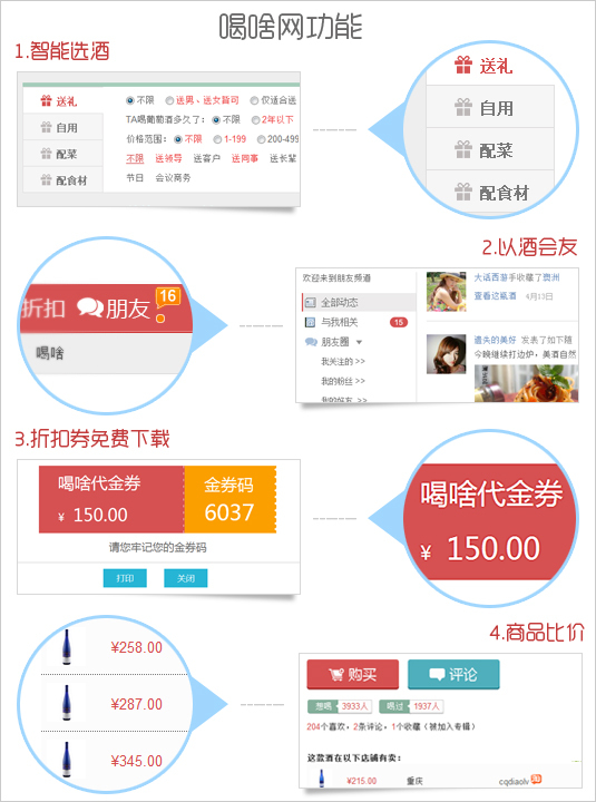中國(guó)葡萄酒市場(chǎng)近年快速增長(zhǎng),預(yù)計(jì)2014年市場(chǎng)年總值將達(dá)到人民幣900億。然而,目前國(guó)內(nèi)的葡萄酒相關(guān)網(wǎng)站主要是電商銷售主導(dǎo),或以業(yè)內(nèi)新聞報(bào)道為主的行業(yè)門戶。提供智能選酒推薦、單品價(jià)格比較、免費(fèi)折扣券下載以及圖片分享、朋友圈社交等功能的網(wǎng)站卻缺乏。喝啥網(wǎng)填補(bǔ)了這方面的空白。