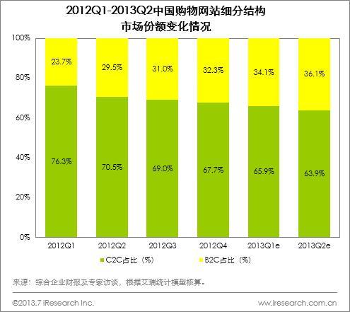 市場(chǎng)結(jié)構(gòu):2013Q2 B2C占網(wǎng)絡(luò)購(gòu)物市場(chǎng)的36.1%,較2013Q1提高2個(gè)百分點(diǎn)