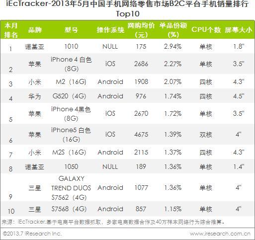 對(duì)于不同品牌手機(jī)銷售而言,2013年5月,B2C平臺(tái)熱銷手機(jī)TOP10以國(guó)外品牌為主,經(jīng)典機(jī)型諾基亞1010、白色iPhone 4穩(wěn)居暢銷榜前兩位。由于小米增加開放購(gòu)買頻次,小米2系列手機(jī)受到米粉熱捧,M2、M2S兩款機(jī)型躋身熱銷榜前十。