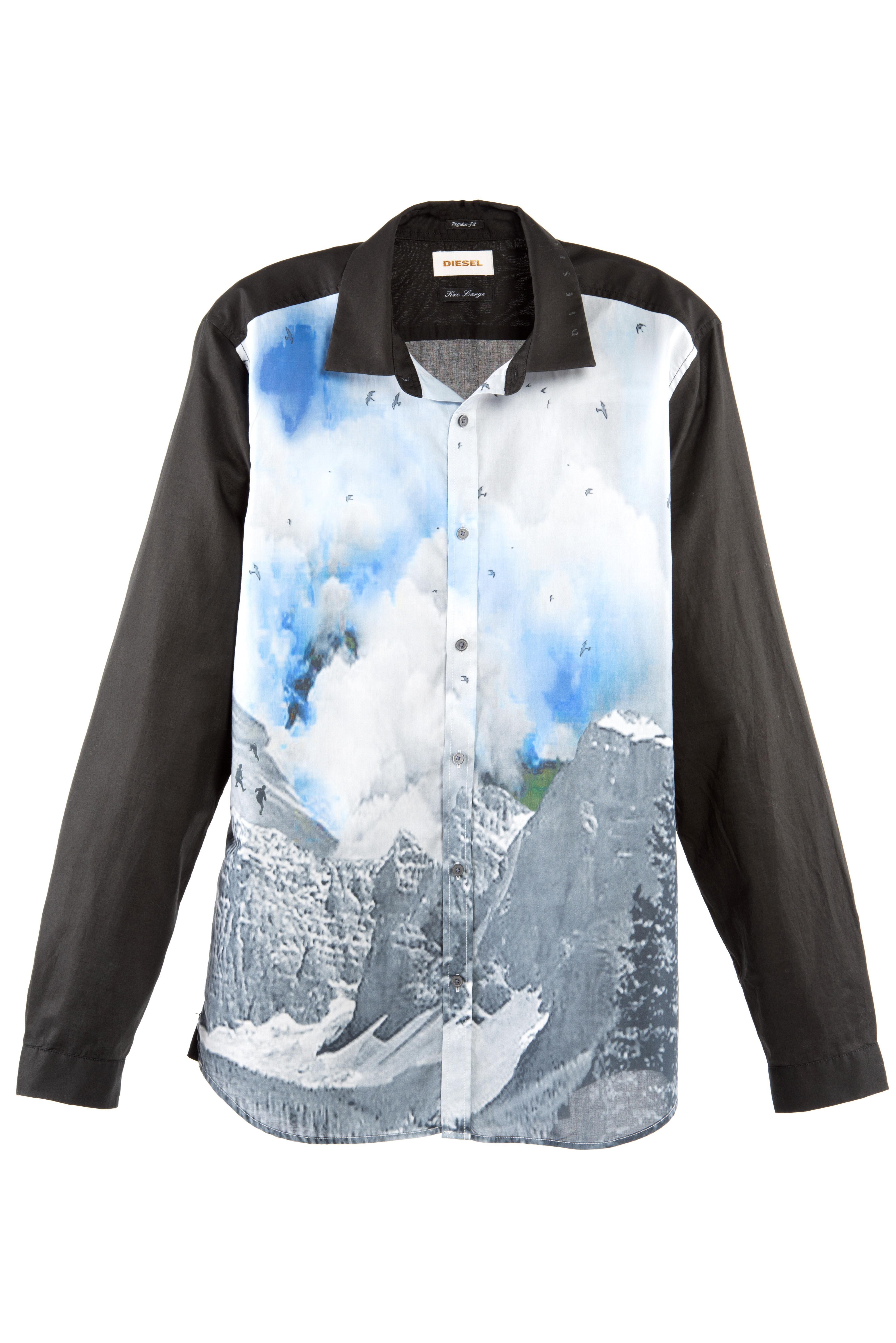 此款印花襯衫的靈感來自于迷彩。設(shè)計(jì)師采用特殊工藝將該系列襯衫處理成為移動的畫布,用照片和圖案在上面描繪出洛杉磯市郊的生活 -- 黑色作為主基調(diào)與藍(lán)紫色的煙云印花形成強(qiáng)烈對比,有如點(diǎn)綴在夜空中的閃亮繁星,大膽的圖案運(yùn)用與吞噬等處理手法無不體現(xiàn)搖滾精神,彰顯DIESEL不羈自我的品牌精神。