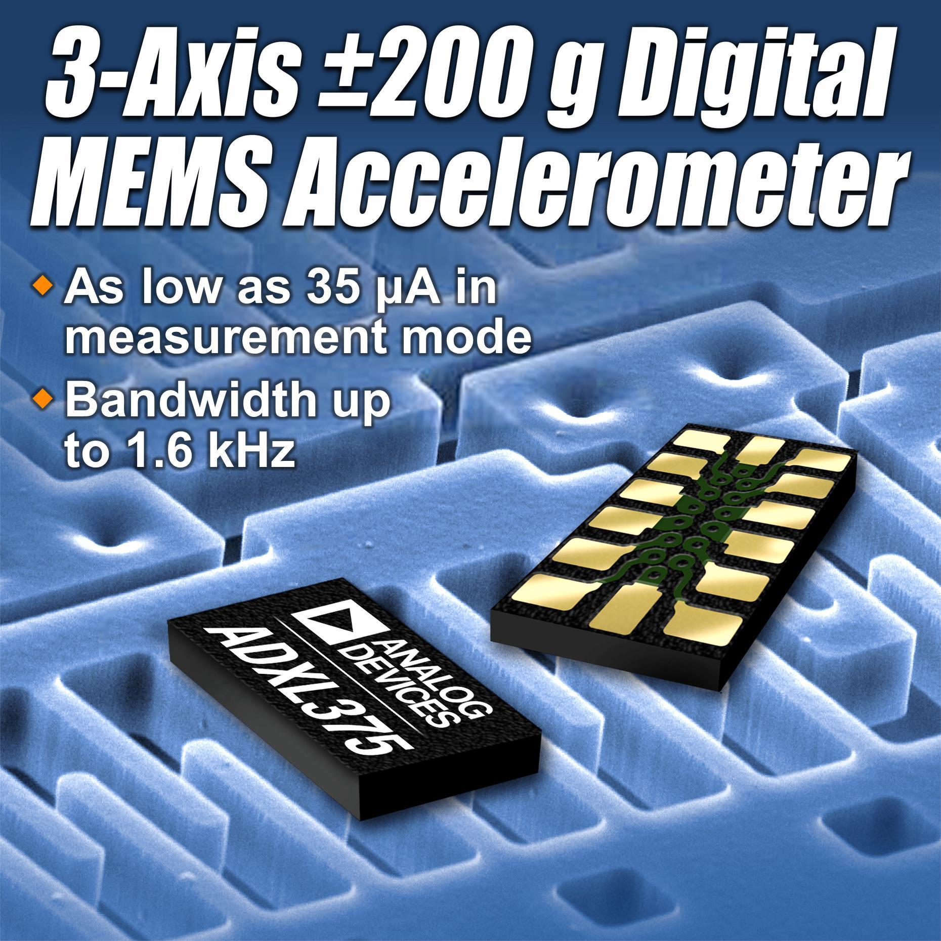 與用于測量高g事件的競爭傳感器相比,ADI公司的ADXL375 200 g數(shù)字MEMS加速度計(jì)可以提供兩倍以上的帶寬,而功耗卻不到其一半。