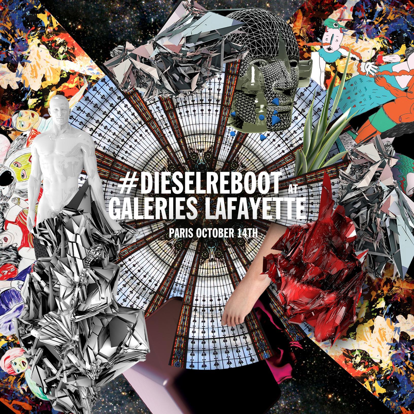 DIESEL的新任藝術總監(jiān)Formichetti篩選了一批來自當今藝術界前沿領域的各類藝術家。其中包括Roxanne Gatt (英國)、Nicolas Boillat (法國)、 Eva Papamargariti (希臘)、Kim Laughton (中國)和 LaTurbo Avedon (美國)。另外,還有幾十位向#DIESELREBOOT Tumblr投稿的創(chuàng)意人士也將在巴黎老佛爺百貨公司展出他們的作品。