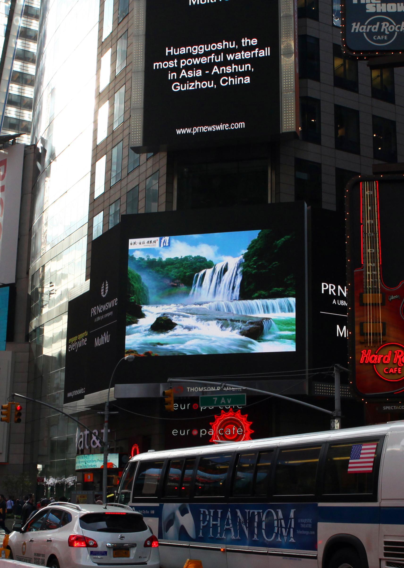 中國(guó)安順2013年10月17日電 /美通社/ -- 2013年10月14日,紐約時(shí)代廣場(chǎng)大屏刊登了1幅黃果樹瀑布?jí)邀惥坝^的圖片,以《黃果樹,亞洲壯觀的瀑布》為題對(duì)黃果樹景區(qū)進(jìn)行了報(bào)道,這是貴州省景區(qū)在海外推廣中首次成功登陸紐約時(shí)代廣場(chǎng)。