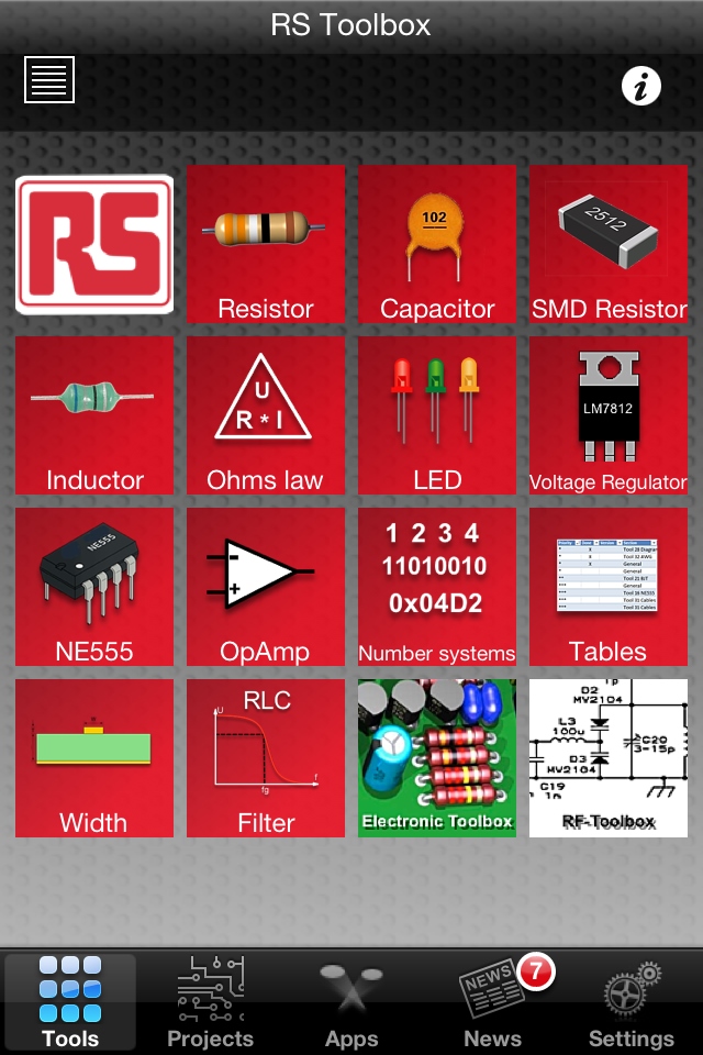 RS Toolbox 提供一系列廣泛的功能,均以圖標(biāo)形式在主屏幕上分組呈現(xiàn),包括多種工程計(jì)算器、轉(zhuǎn)換器和查詢表。例如RLC濾波計(jì)算器,555定時(shí)配置器,用于各種穩(wěn)壓器和運(yùn)算放大器的計(jì)算器,以及諸如編號(hào)系統(tǒng)轉(zhuǎn)換器和歐姆定律計(jì)算器等基本工具,還有包括電池類(lèi)型與尺寸、電纜顏色編碼、封裝尺寸和螺線管規(guī)格等內(nèi)容的查詢表。