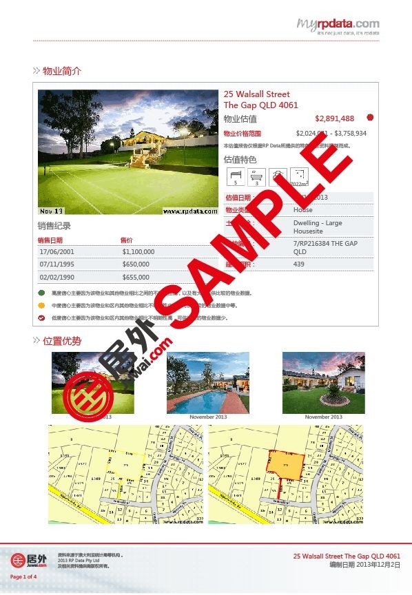 該報告為有意在澳大利亞置業(yè)的中國買家提供極具價值的房產(chǎn)信息,助其做出更明智更博識的投資決定。買家只要登陸居外網(wǎng)澳大利亞房源頁,選取任何一個房源,即可免費(fèi)獲得該房源的詳細(xì)中文報告。報告涵蓋該房產(chǎn)的銷售歷史、小區(qū)銷售情況、區(qū)內(nèi)人口面貌、家庭收入和結(jié)構(gòu)分析、土地和房價價值評估。報告中所引述的數(shù)據(jù)均來自澳大利亞統(tǒng)計(jì)局等政府權(quán)威機(jī)構(gòu)。